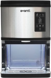 The sleek, compact design fits perfectly on your countertop and is ideal for the kitchen, office, lobby, break room and more. Add water and within 10 minutes, you will be enjoying soft, chewable nugget ice. The easy-to-use digital touchscreen control panel offers eight functions: make ice, clean, auto clean, dispense ice, add water, ice full, ice block and on/off. Ideal for entertaining, the storage bin holds over 3 pounds of ice at a time, so you always have plenty of ice on hand for soft drinks, cocktails, iced coffee and other beverages. The easy-access, see-through water reservoir holds up to three quarts of water. This stainless steel portable ice maker is made with BPA-free parts and does not require a water hookup. With the Avanti Digital Nugget Ice Maker with Dispenser, you can add soft, chewy nugget ice to your favorite beverage anytime. Covered by the Avanti Two-Year Limited Warranty.